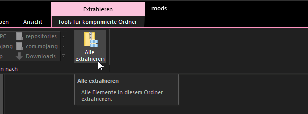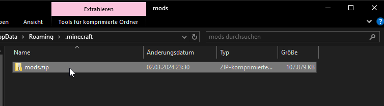 Wenn du die mods.zip-Datei dann einmal auswählst siehst du oben in der
